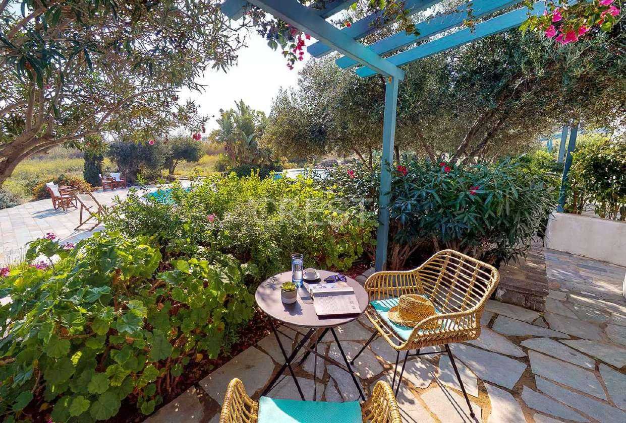 is a stunning property filled with natural light and offering breathtaking views of the Aegean Sea. Nestled within a traditional ‘Kyklades’ style development in the charming fishing village of Molos, this villa provides direct access to a communal swimming pool.