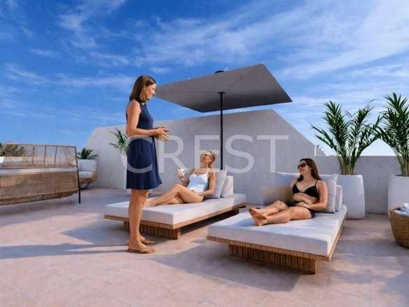 The properties are designed to make the most of outdoor living: the ground floor and first-floor apartments offer large terraces, while the penthouses feature spacious private solariums, perfect for relaxing in the sun all year round.
