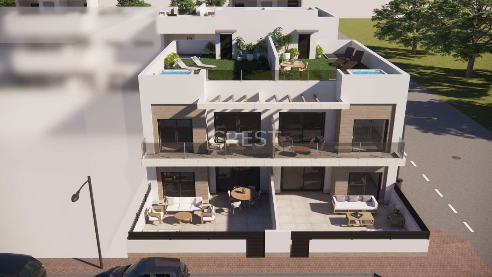 In Rojales you live in style and comfort, with plenty of space to enjoy outdoor living. These modern apartments combine light, functionality and contemporary architecture. You can choose between a ground-floor apartment with a large terrace or a first-floor apartment with a spacious solarium, where you can relax or dine under the stars in complete privacy. Optionally, the terrace or solarium can be equipped with a jacuzzi (at an additional cost).
