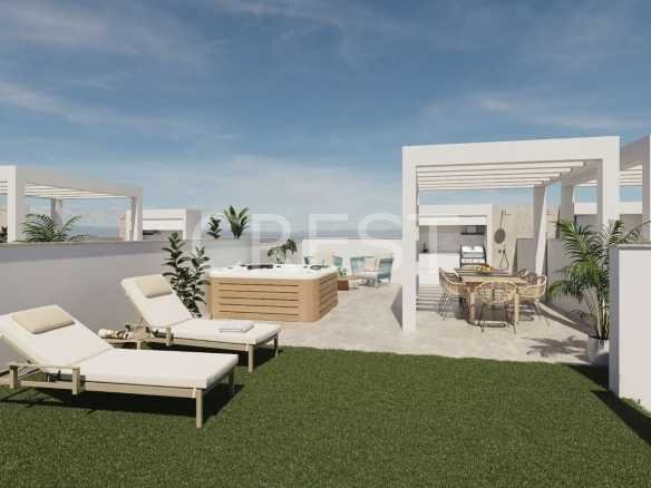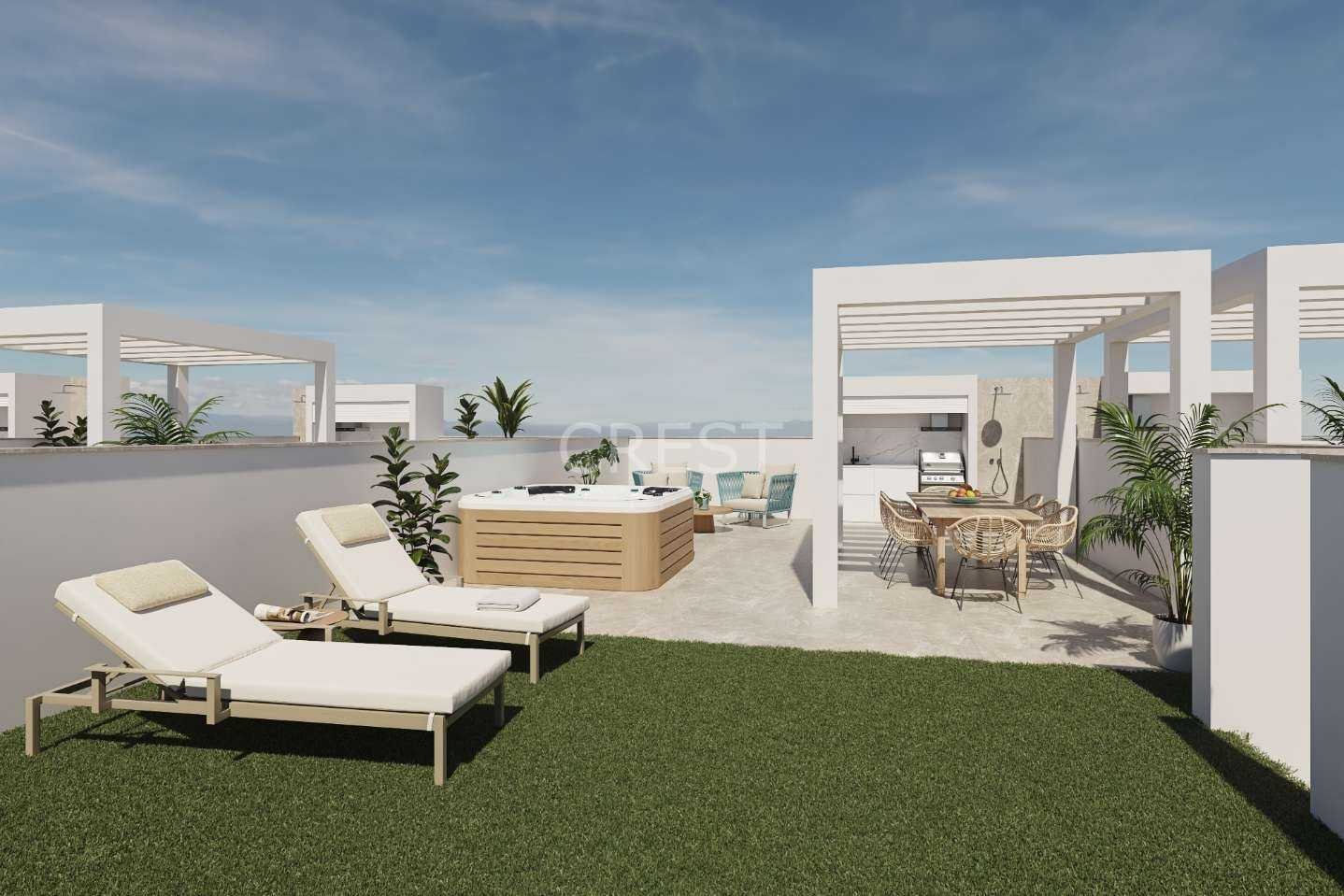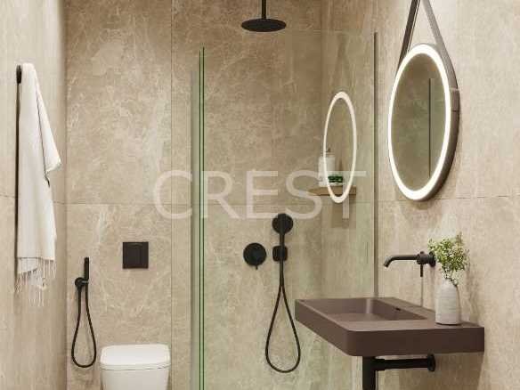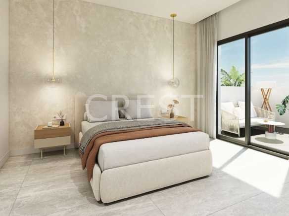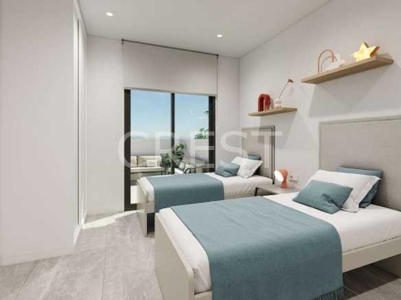 Choose from 2 or 3-bedroom layouts, with options for ground floor residences featuring private gardens and patios, or upper-floor homes with spacious solariums, each complete with a pre-installation for a jacuzzi, a pergola, a shower, a motorized shutter and fully equipped outdoor kitchen – ideal for relaxing or entertaining under the sun.Inside, you’ll find bright, open-plan living areas finished in natural wood and soft neutral tones, creating a warm and sophisticated ambiance. The master bedrooms offer direct access to private terraces, allowing you to enjoy the gentle Mediterranean breeze in total privacy.