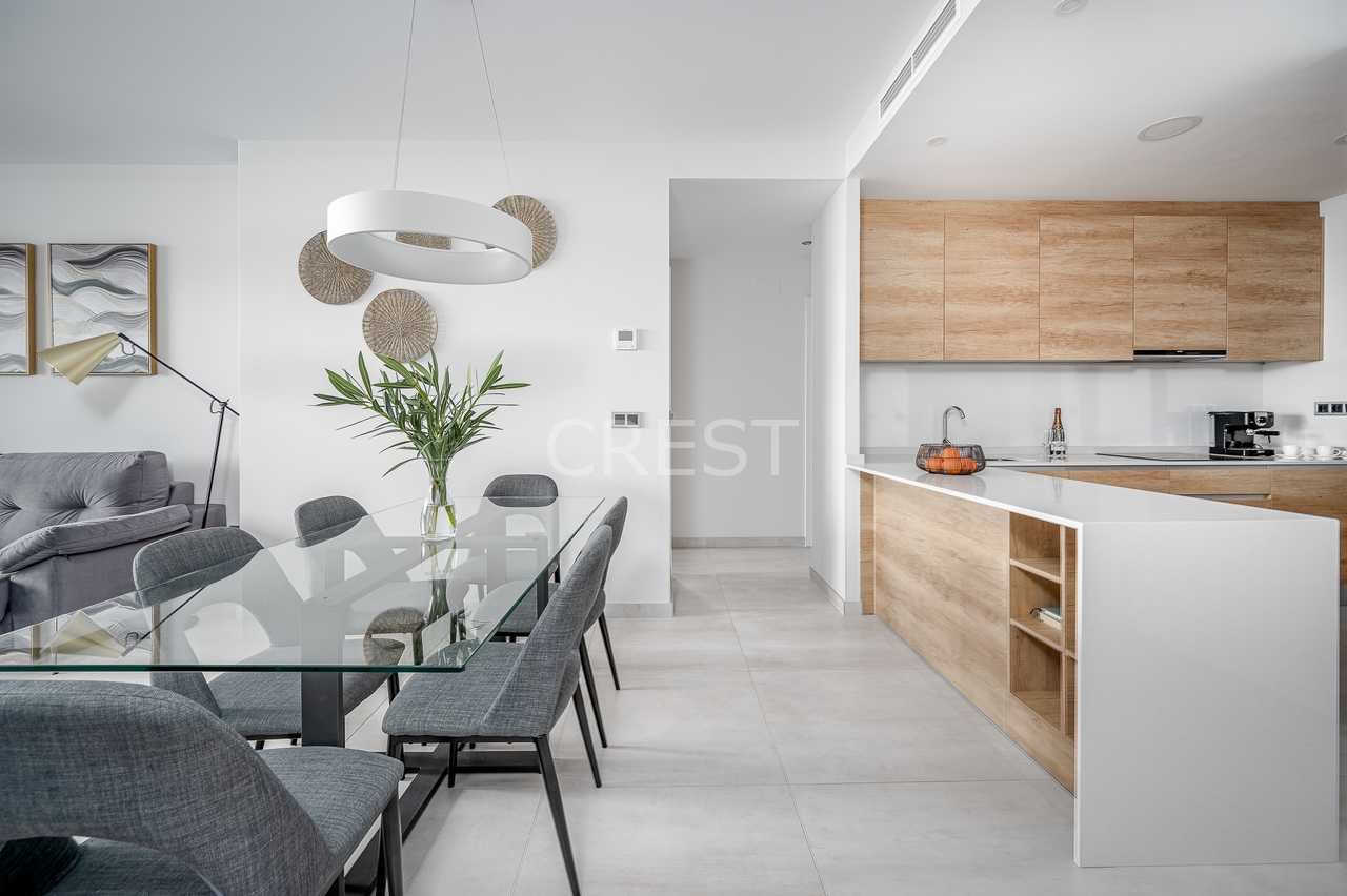 The apartment features 2 bedrooms, 2 fully fitted bathrooms, and a designer kitchen equipped with top-of-the-line integrated appliances. The generous living area opens onto a large private terrace—perfect for relaxing and soaking in the sea breeze.