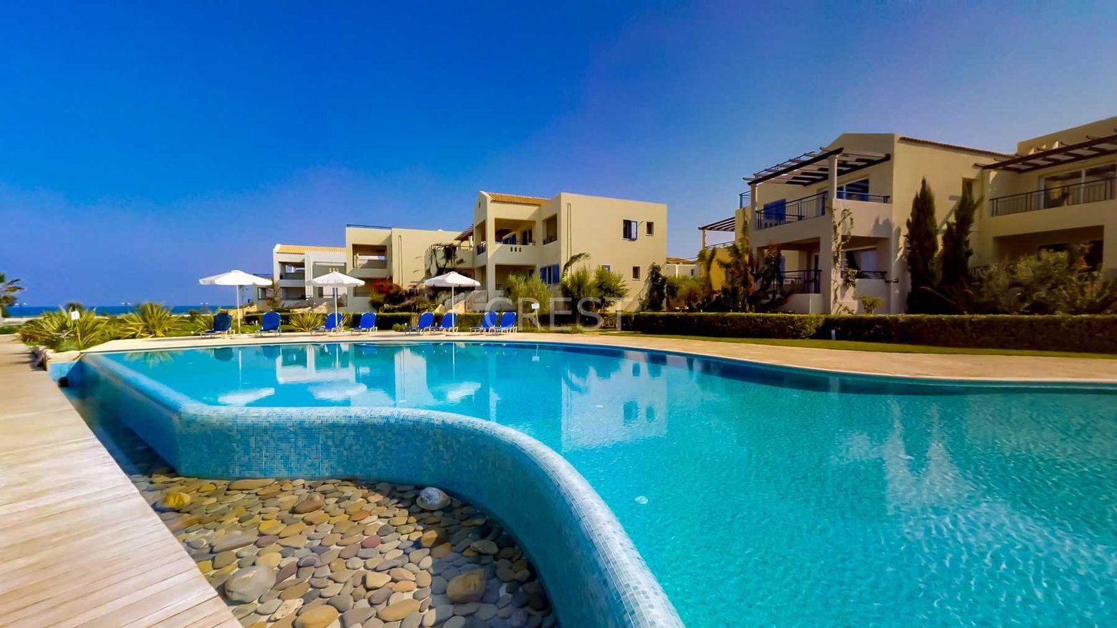 This exclusive development, conveniently situated in the prestigious area of Pirgos Psilonerou on the beach, boasts magnificent views of the Mediterranean Sea and the picturesque mountains. Extensive use of local materials and lush landscaped gardens of local character, ensure the development is at one with the environment.