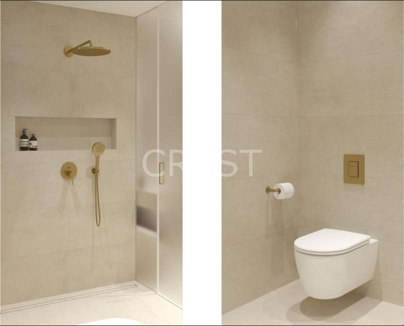 Every villa is built to the highest standards, featuring a beautifully furnished kitchen complete with premium appliances, double-glazed low-emission windows for optimal insulation, and stylish white built-in wardrobes with integrated storage solutions. The bathrooms are fully finished with sleek fixtures, including rain-effect showers, integrated washbasins, wall-mounted cabinets and illuminated mirrors. LED lighting is installed throughout, using high-efficiency systems paired with premium switches and sockets.