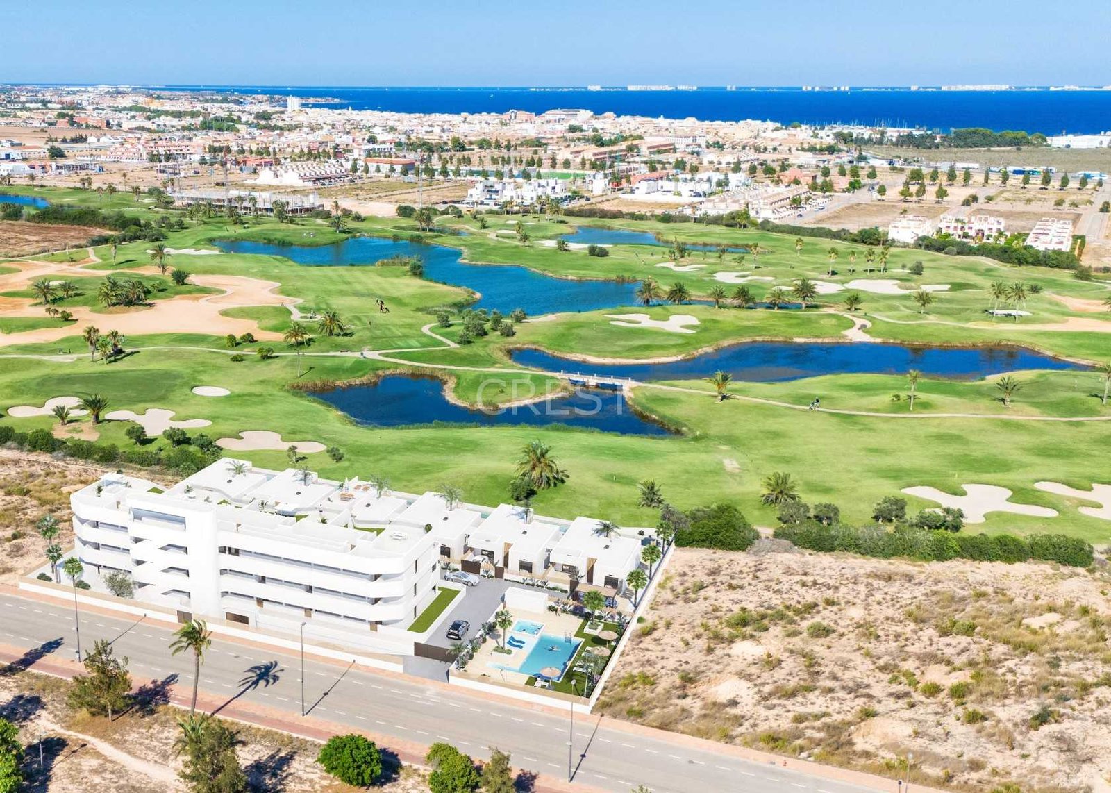 The residencial is located in a frontline of the prestigious golf course. This golf course is well renowned for its lakes and vegetation that interweave with the golf course. The water and lakes are present in 16 of the 18 holes, but all the course is designed to offer the golfer different strategies in each hole. Another aspect that makes this golf course unique is that it’s connected by walking to the city centre, something impossible to find in other golf locations that allow us to enjoy the calm and the beauty of the area without refusing the access to the services that los Alcázares offers.