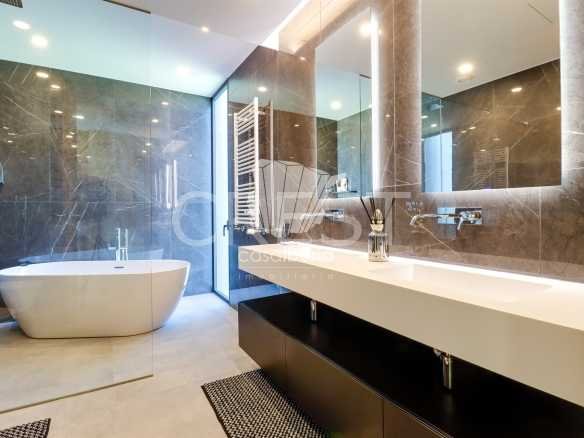 On the ground floor, the elegant entrance hall leads to a spacious living and dining area with direct access to the outdoor terrace, the heated pool, and a modern kitchen equipped with Bosch appliances and a pantry, with access to the BBQ area and garden. This floor also includes a guest bathroom, a large en-suite bedroom, and a storage area.