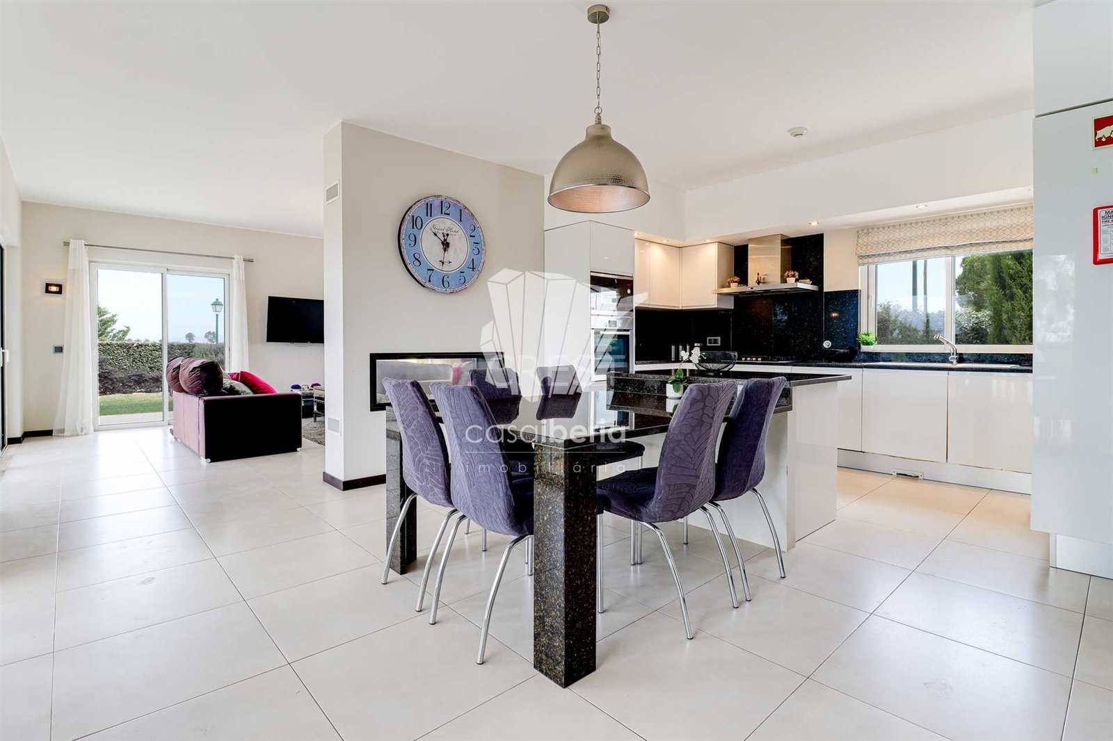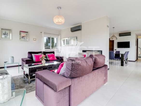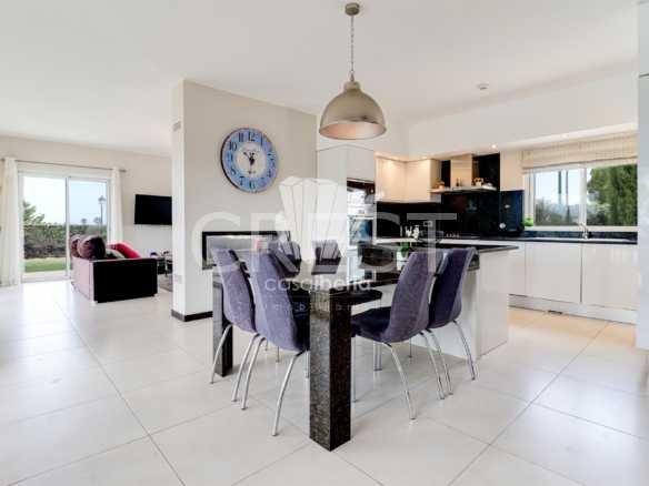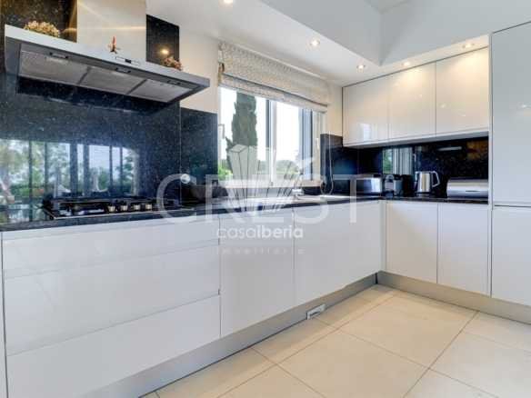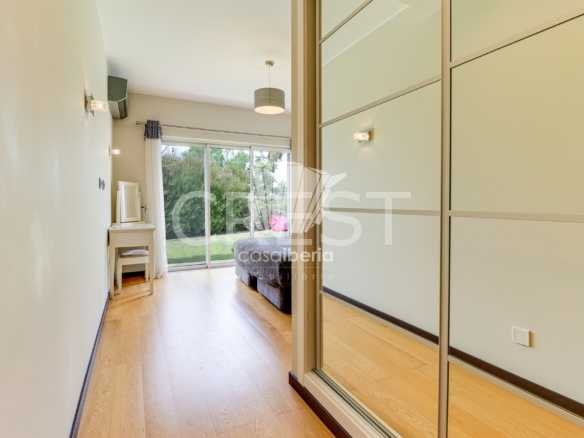 Upon entering to your right, you´ll find an open-plan kitchen with high-quality fitted appliances, a central island and granite work surfaces, and a pantry. Alongside, a spacious dining room opens onto the living room and its fireplace overlooking the pool and golf course.