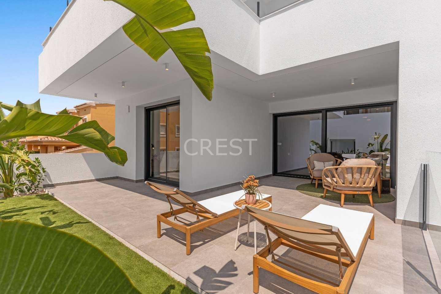 The apartments are designed with a focus on space and natural light and feature spacious terraces, private gardens, or a solarium, depending on the property type. Thanks to the open layout and large windows, natural light is maximized, creating a harmonious connection with the beautiful Mediterranean surroundings. You can choose between two- or three-bedroom apartments with two bathrooms, all finished with high-quality materials and a modern open-plan kitchen.