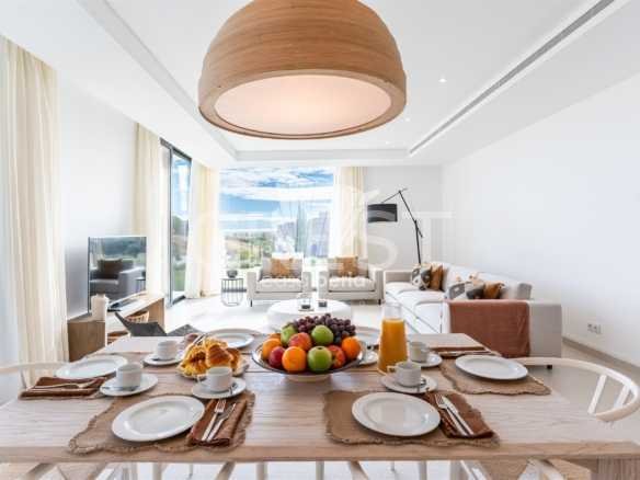 This flat consists of a kitchen, dining and living room with direct access to one of the balconies, 1 guest bathroom, and 2 suites with fitted wardrobes and direct access to the outside area. Situated in a private Golf Resort which also offers access to the Spa area, swimming pool and gym.