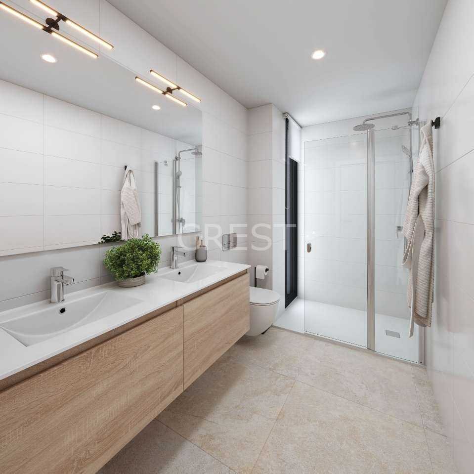 Layout: one double bedroom and bathroom on the ground floor, a second bedroom and guest bathroom on the first floor, plus an impressive master suite with en-suite bathroom and access to a panoramic balcony. All bedrooms are equipped with fitted wardrobes, electric shutters, and TV points.