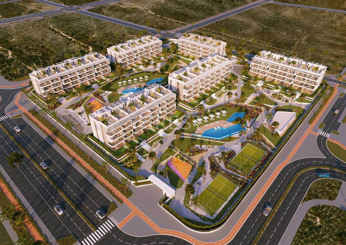 This exclusive new residential development offers a carefully designed collection of 172 contemporary homes set across six elegant buildings, each rising from a ground floor to three upper levels, with two underground floors dedicated to private parking and storage. The project has been conceived to combine comfort, space and lifestyle, offering 2- and 3-bedroom homes, all featuring two full bathrooms and bright, well-balanced layouts that open towards the extensive communal areas, ensuring pleasant views and a strong sense of openness throughout the complex.