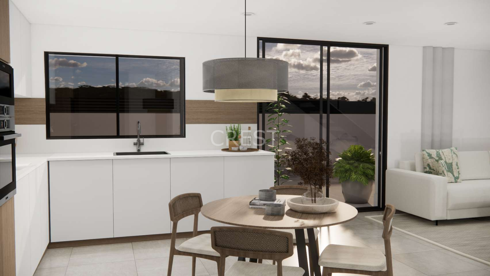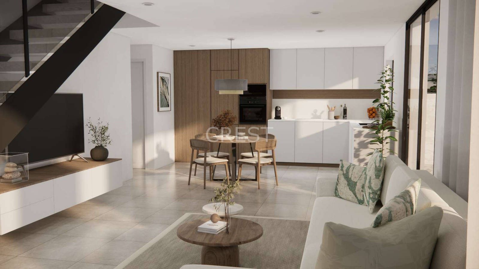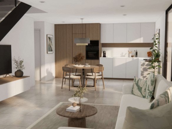 Each home features 3 bedrooms and 2 bathrooms, ideal for families or couples looking for space and convenience. The fully fitted kitchen connects to a bright, open-plan living area, designed to make the most of the Mediterranean indoor-outdoor lifestyle. Solarium optional.