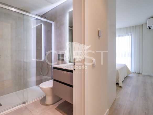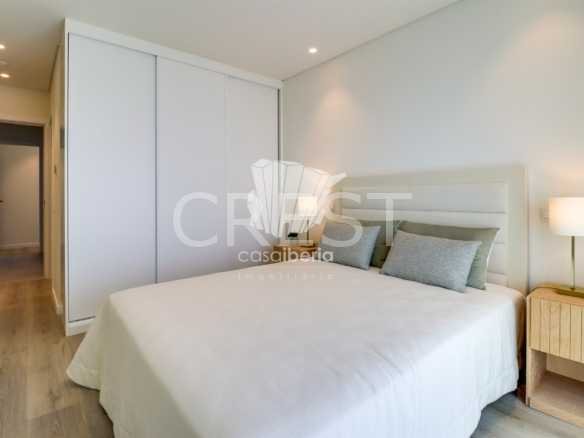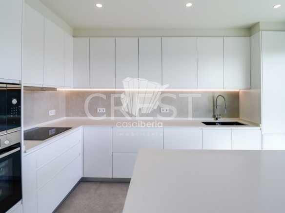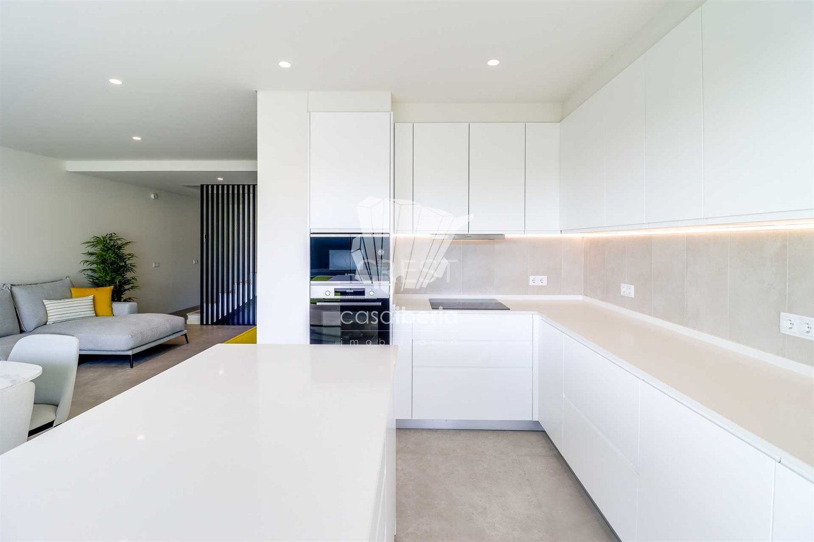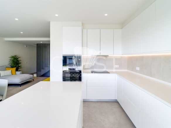 The kitchen, fully equipped with built-in appliances from the Bosch brand, has a contemporary design, with minimalist lines and neutral tones, and is in an open space concept, in perfect harmony with the common room.