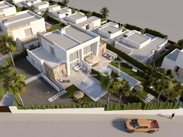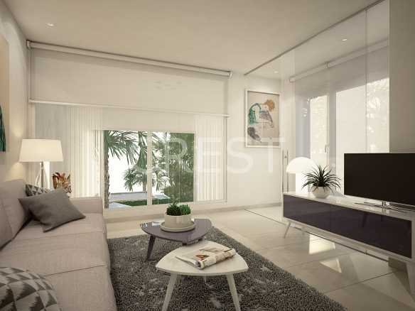 The villas (semi-open development) include a spacious living room with open kitchen, 2 bedrooms and bathroom on the ground floor and a third bedroom with bathroom on the upper floor. Nice garden with terrace and private pool and a parking space. Some villas have a large basement.