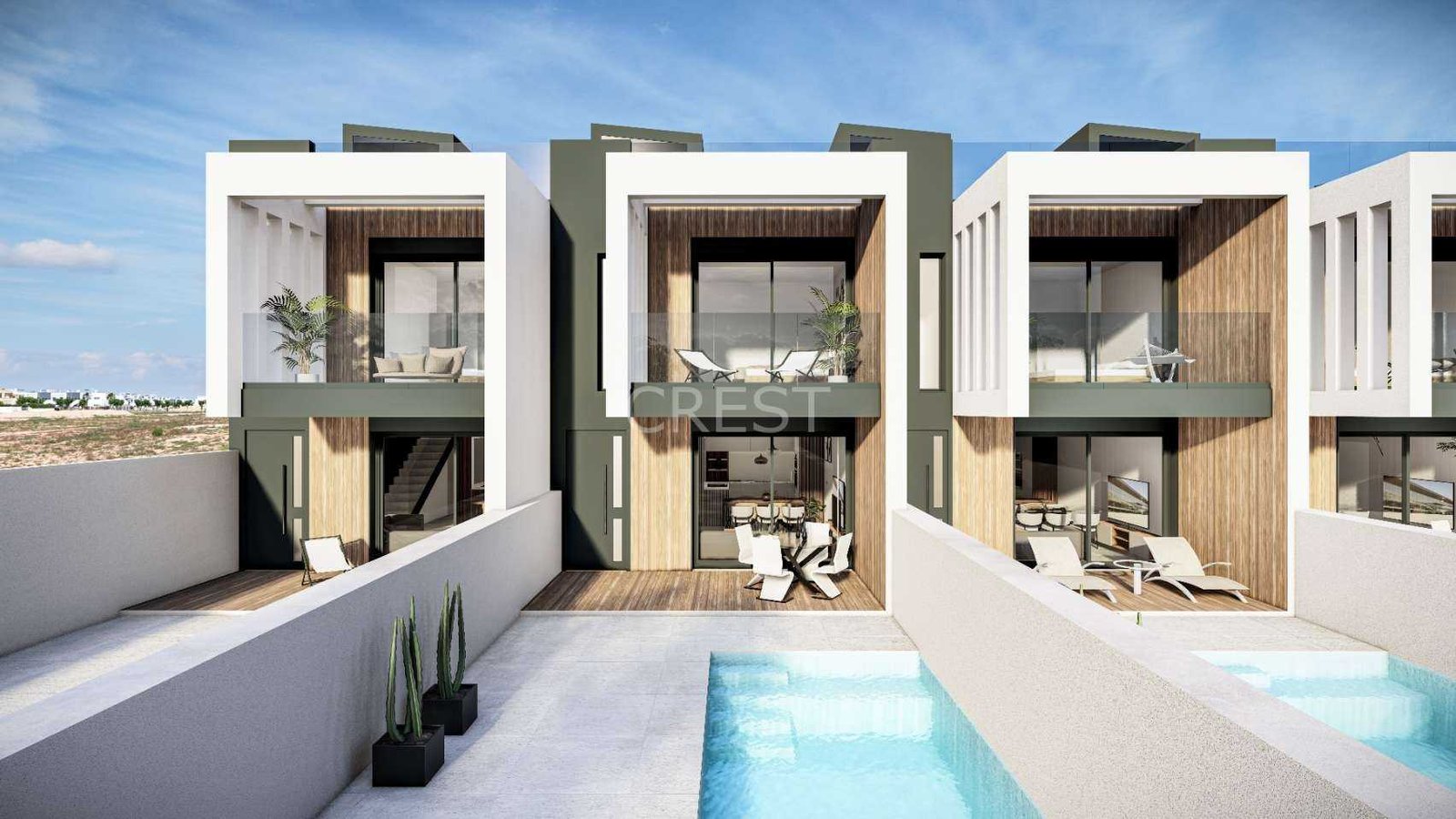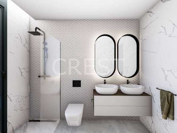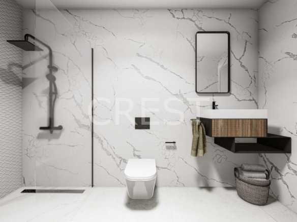 Every aspect of these homes reflects a commitment to both comfort and energy efficiency. A private swimming pool with LED lighting and an outdoor shower offers the perfect retreat, while the rooftop solarium includes a summer kitchen for unforgettable moments with family and friends. Bathrooms are beautifully finished with floating vanities, wall-mounted toilets, rain showers, and glass screens. The integration of photovoltaic solar panels contributes to a more sustainable and cost-effective way of living.