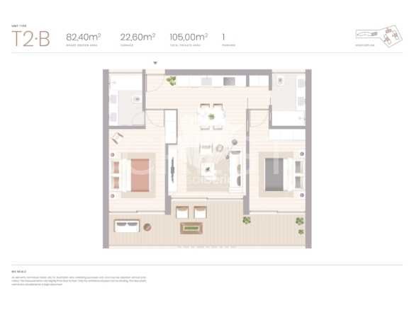 It consists of an open space that includes a living and dining area and kitchen, a suite, a second bedroom and a bathroom.