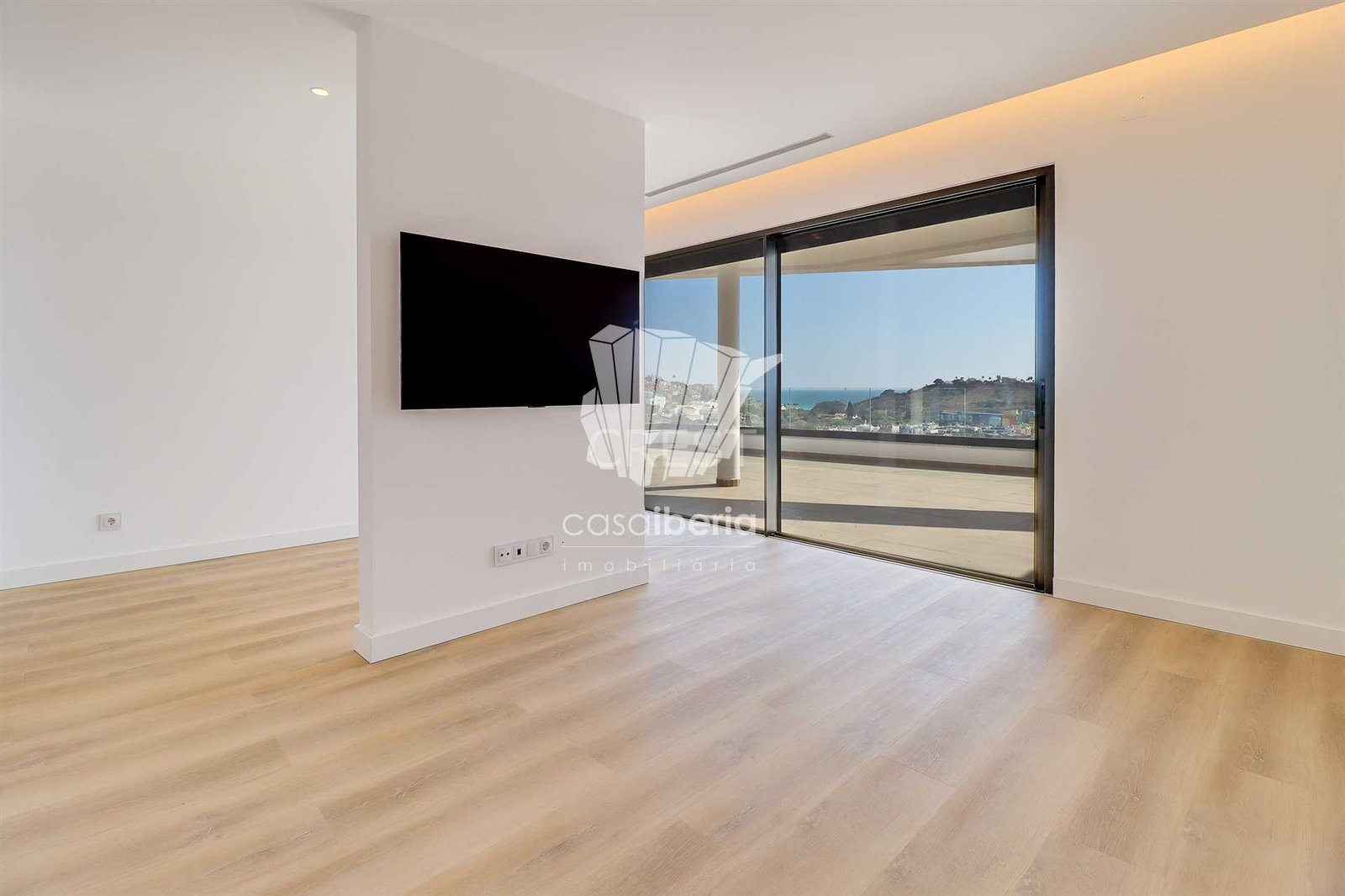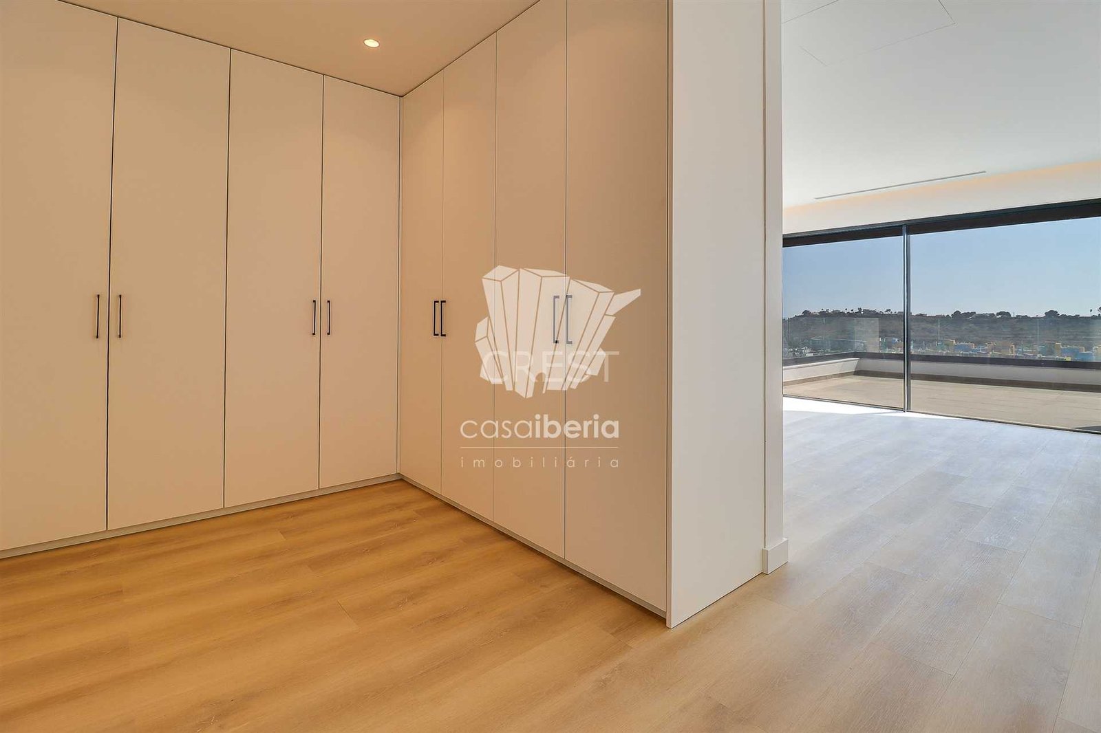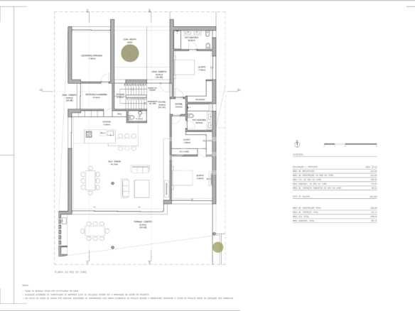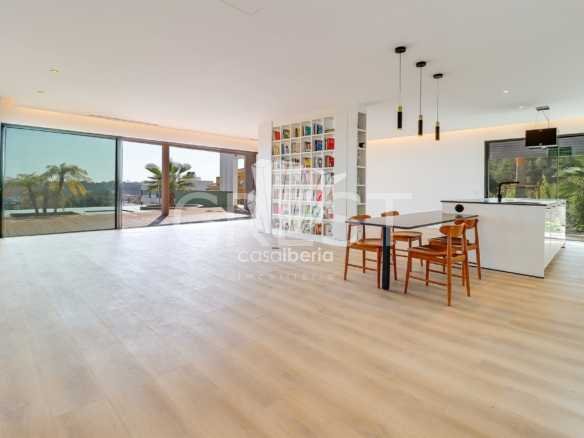 It has an imposing entrance to the social area, with a living and dining room and kitchen equipped with an open-plan island, very spacious, with natural light thanks to the glass windows that extend from floor to ceiling, thus offering a panoramic view over the sea and the tropical garden, eliminating any barrier between the interior and the exterior. This perfect fusion between the spaces allows for a continuous experience, where the huge terrace, the pool and the jacuzzi become a natural extension of the interior area of the house.