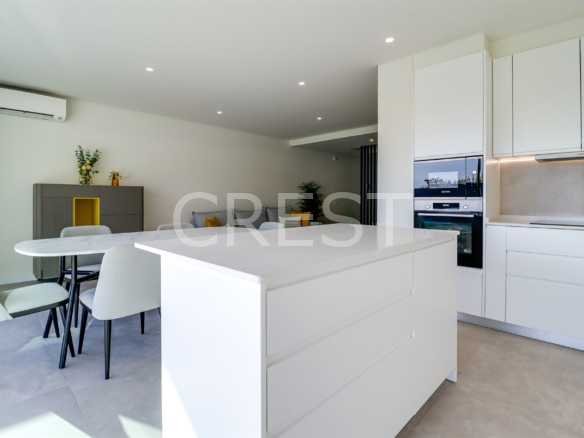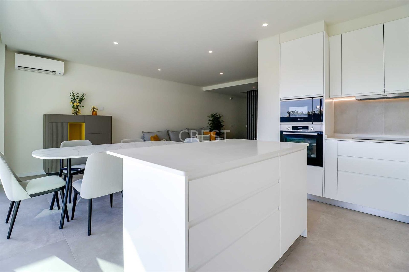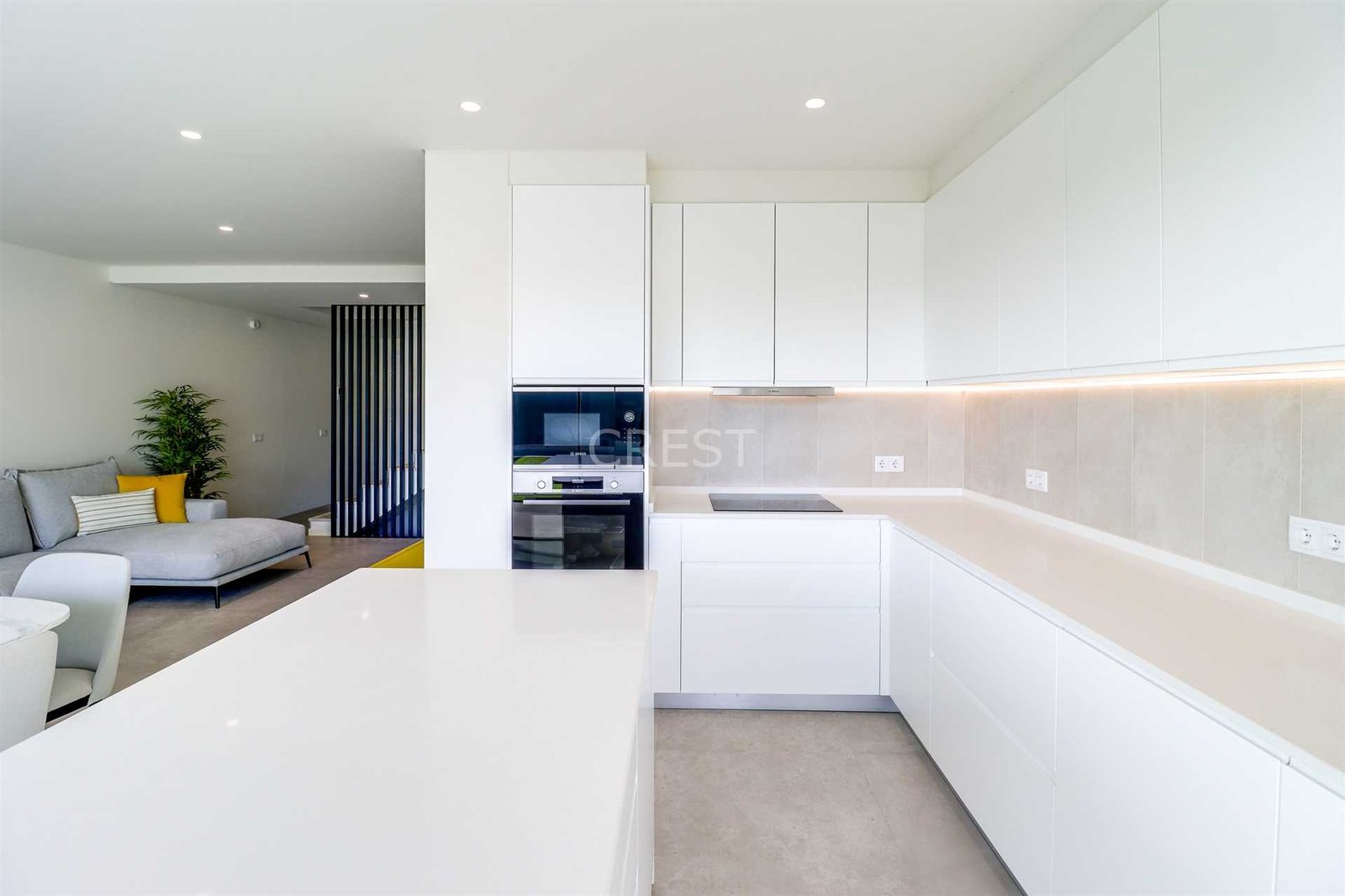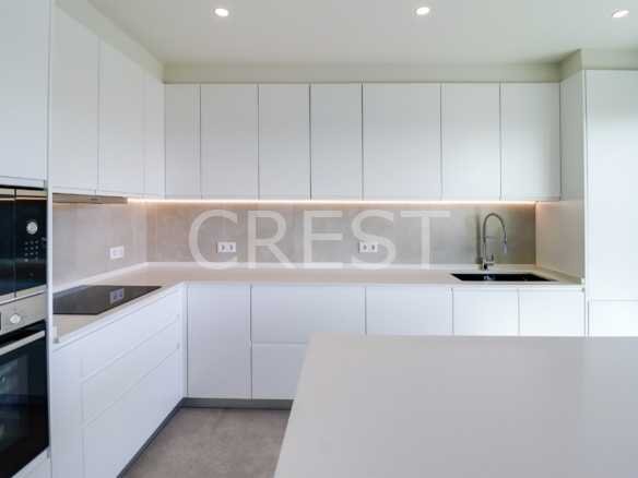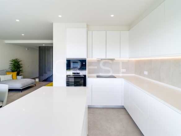 The kitchen is equipped with Bosch-branded appliances, all modernity of neutral and minimalist tones.