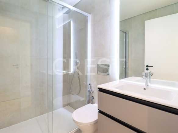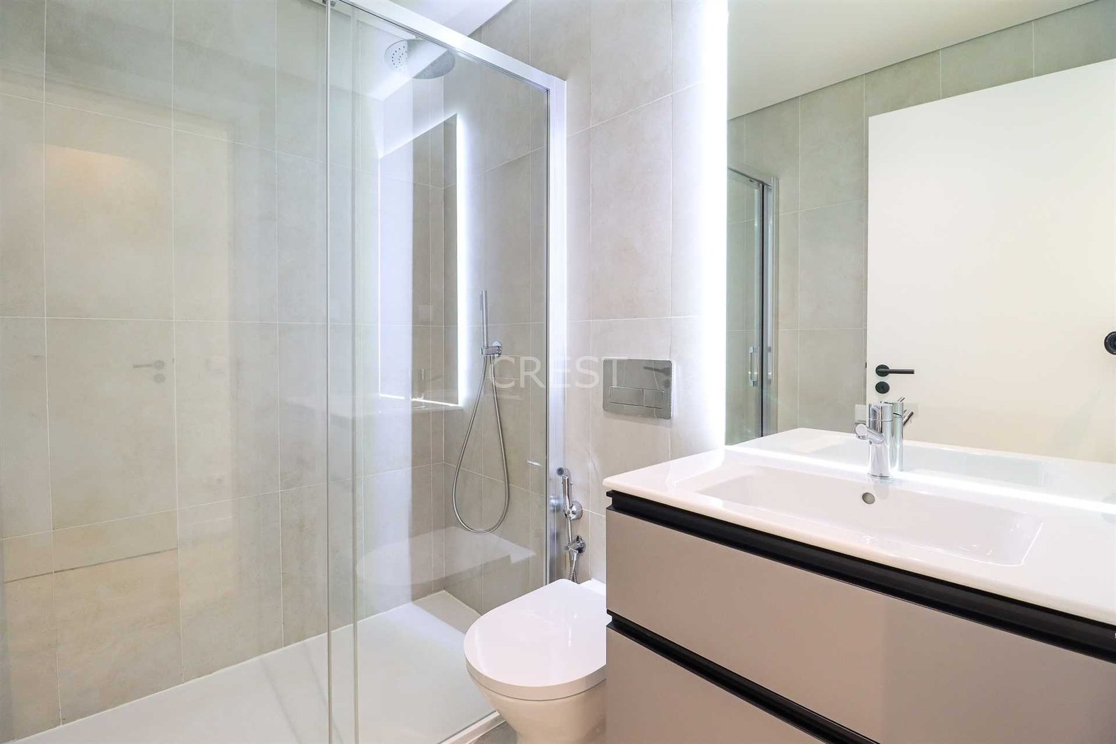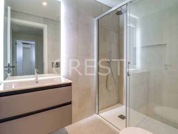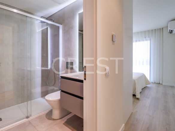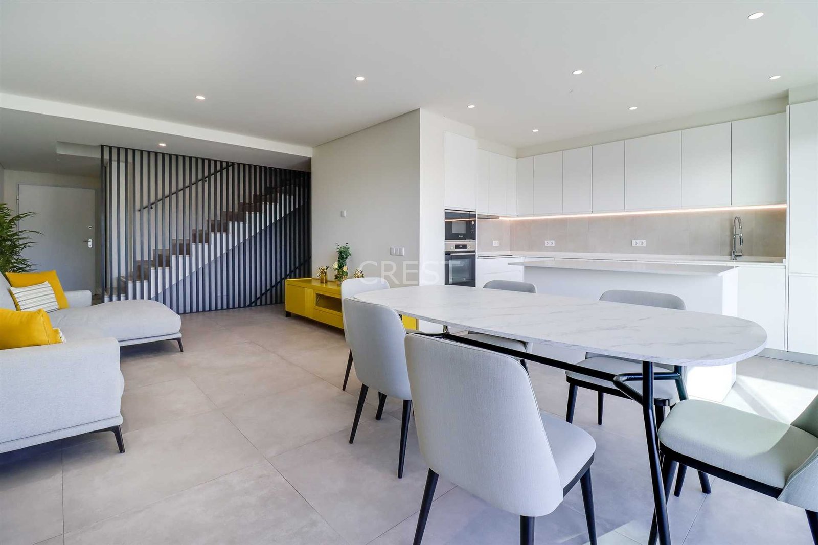 The kitchen is equipped with Bosch-branded appliances, all modernity of neutral and minimalist tones.