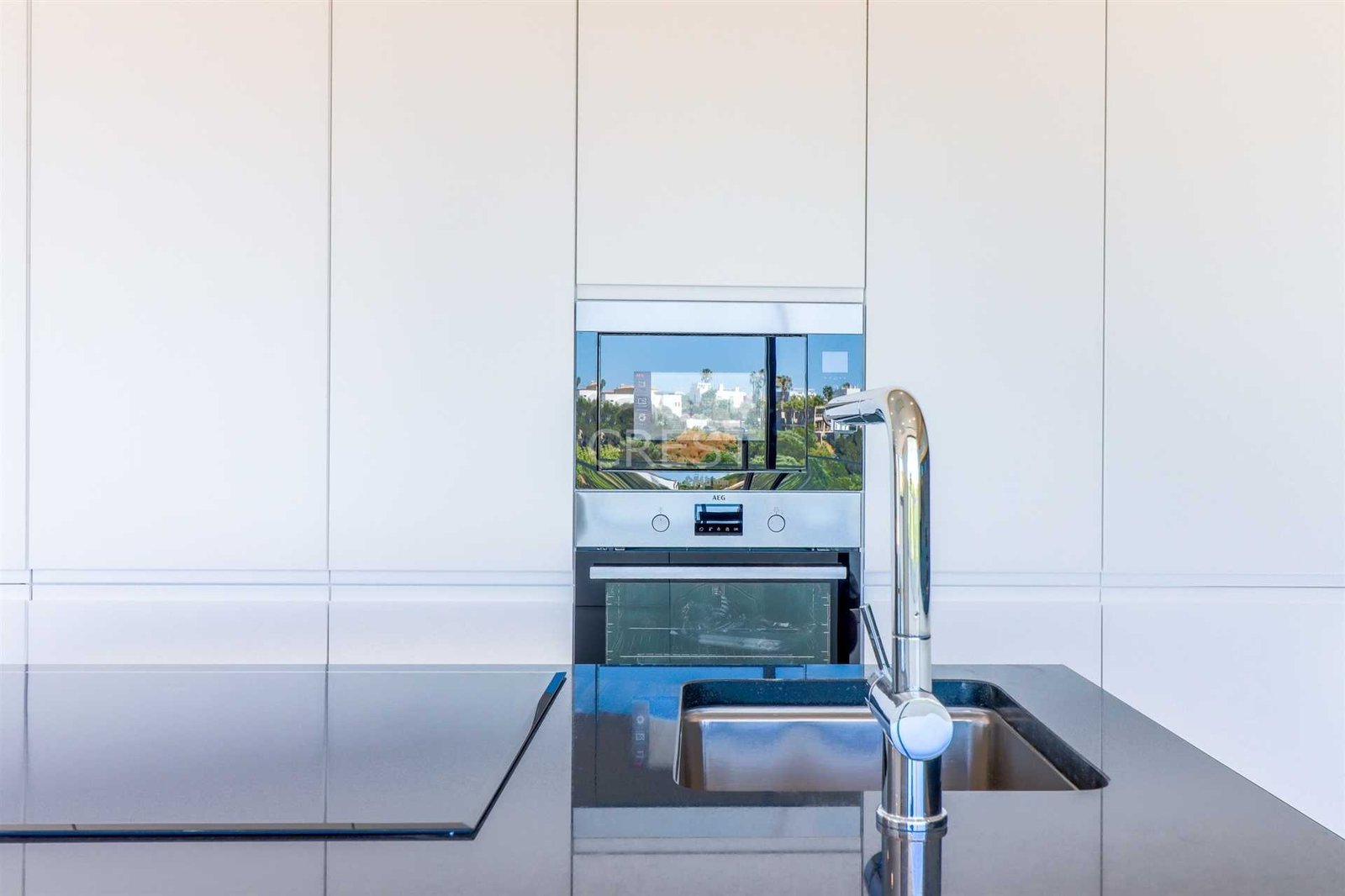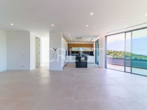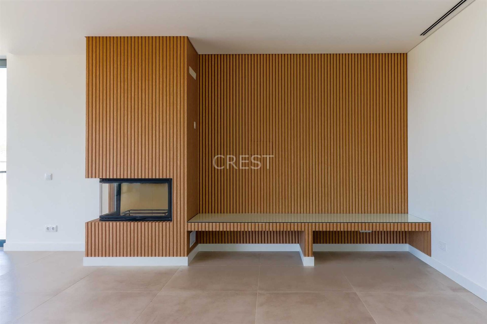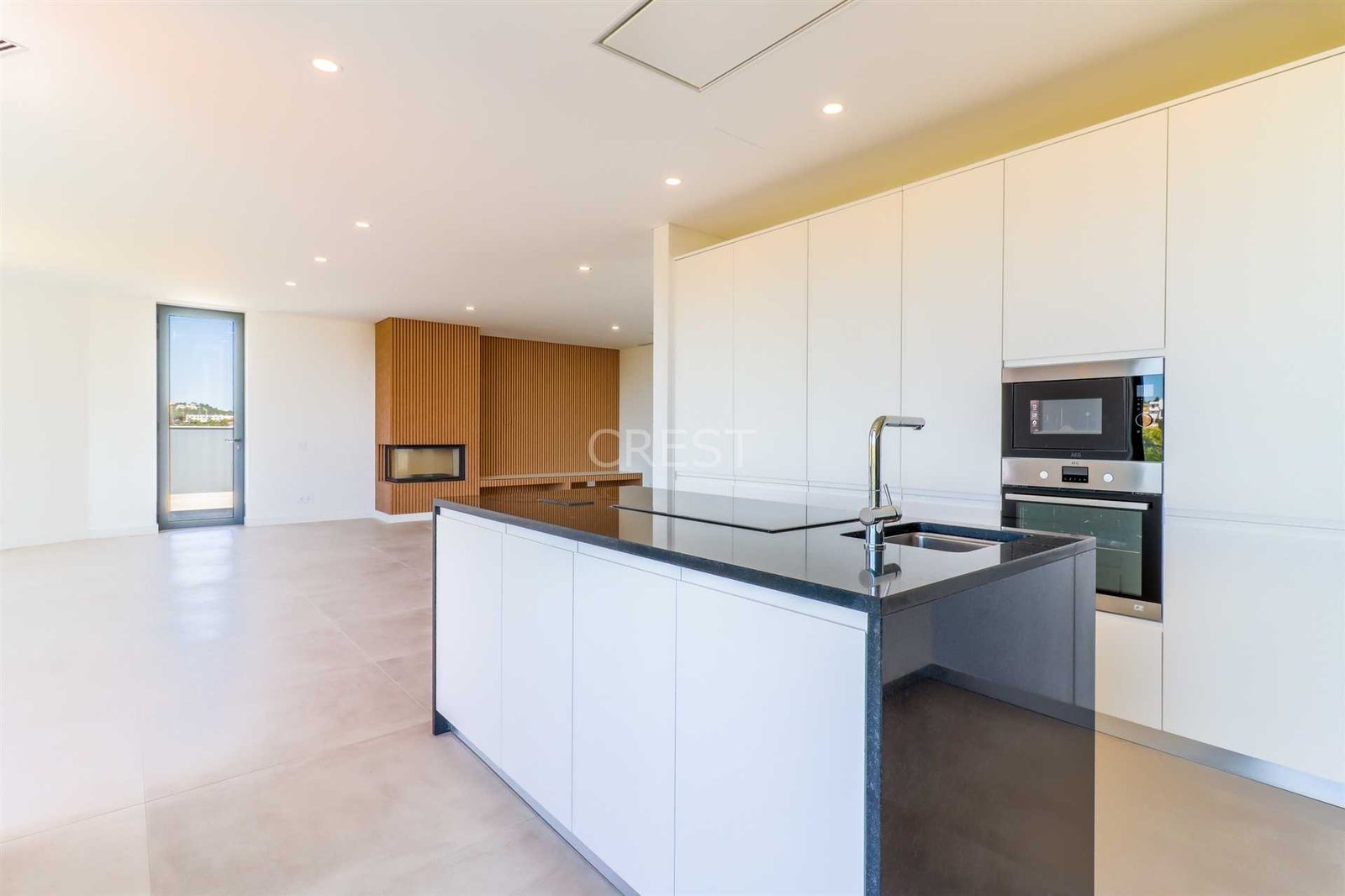 Spacious open-plan living room with a modern fireplace and a fully equipped kitchen with top-of-the-line appliances. Both rooms open onto a generous terrace with stunning views of the ocean.