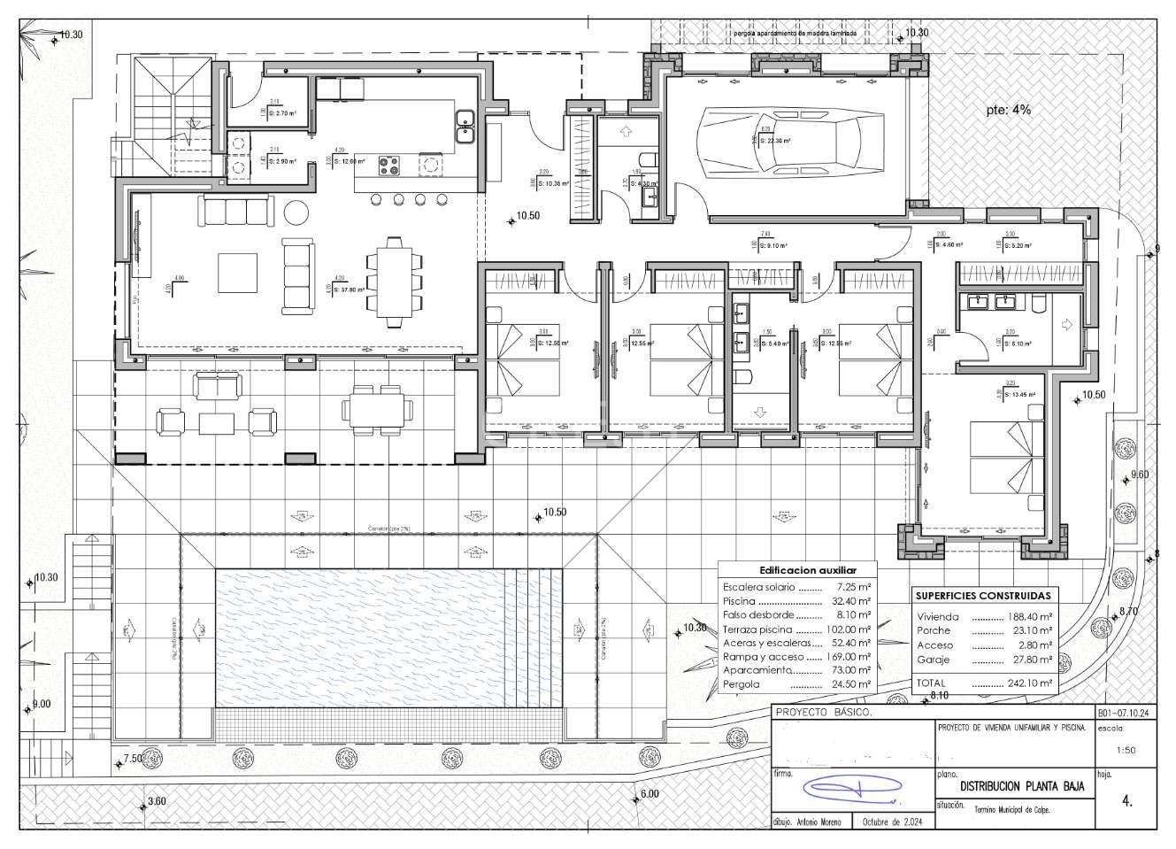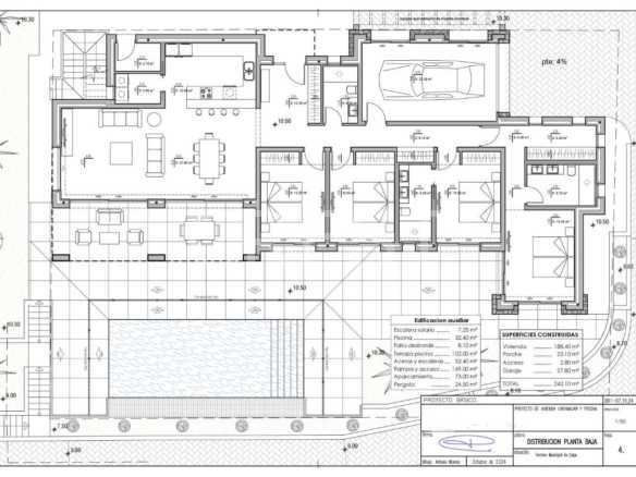 The night area offers absolute privacy, comprising four stylish bedrooms and three well-appointed bathrooms. Two bedrooms feature en-suite bathrooms, and all enjoy plenty of natural light and lovely views towards the Peñón de Ifach.