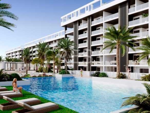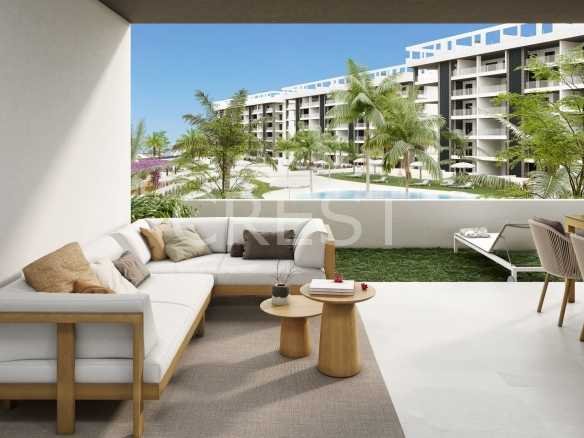 The development is a private gated community, 700 metres from the beach.. The development stands out for its ample landscaped areas and complete installations, from which you will be able to enjoy the sun; the communal areas include cascading pools and landscaped gardens.