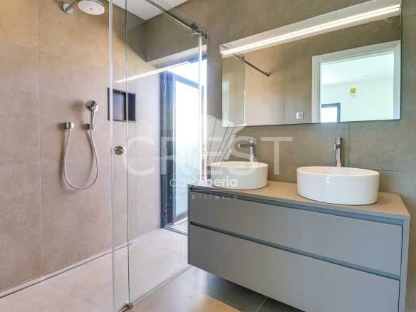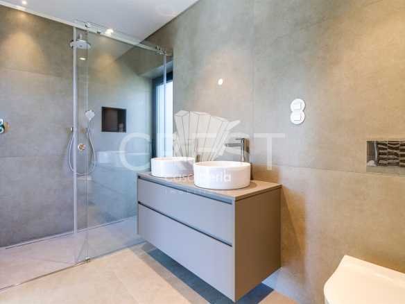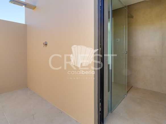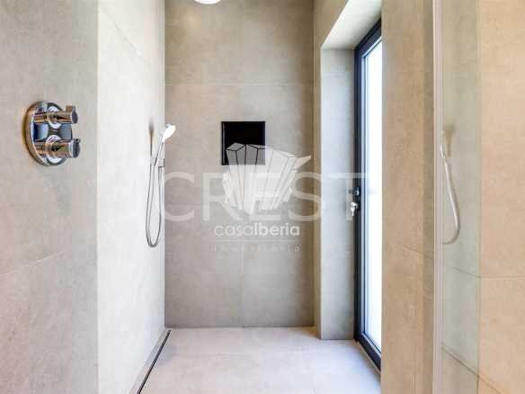 On the ground floor, there are two spacious suites with walk-in closets, while on the first floor, there are two more, including the master suite. All bathrooms are equipped with an additional outdoor shower, ideal for enjoying during the hot summer months.
