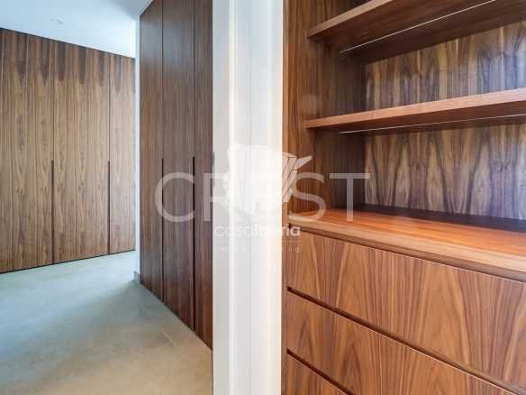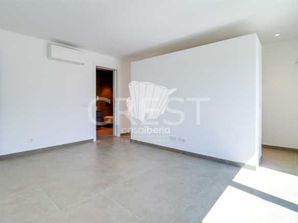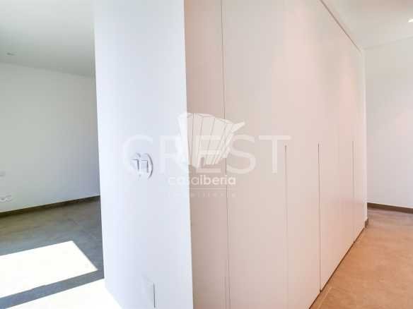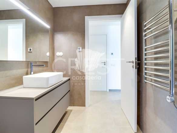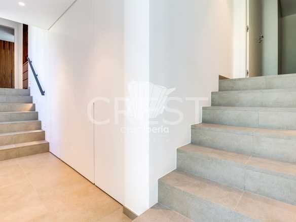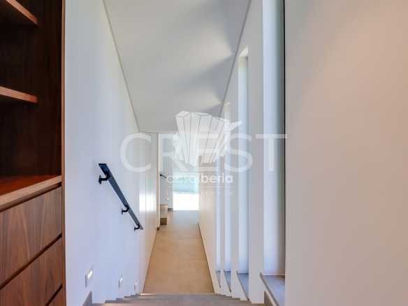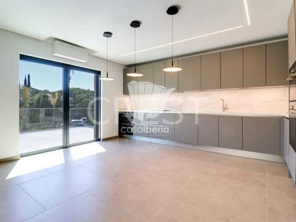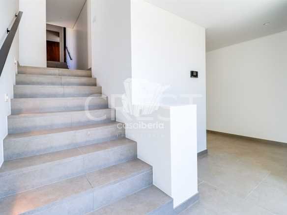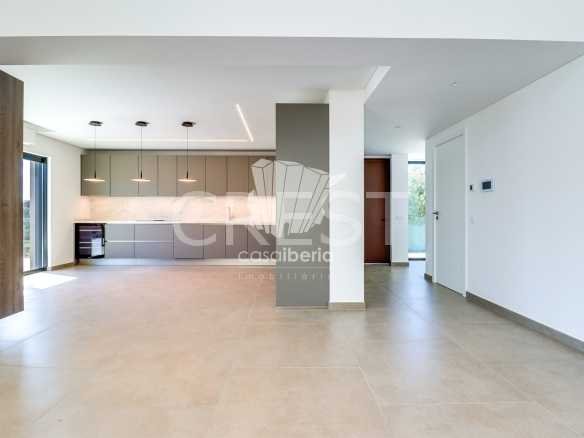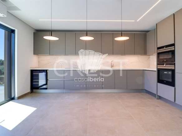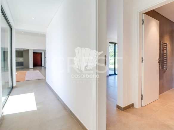 Upon entering through the main entrance, we are greeted by a hallway leading to a spacious living-dining room and an open-plan kitchen, equipped with high-quality appliances. In the living room, we have access to a covered terrace, which offers and allows us to enjoy the view of the garden and the pool.