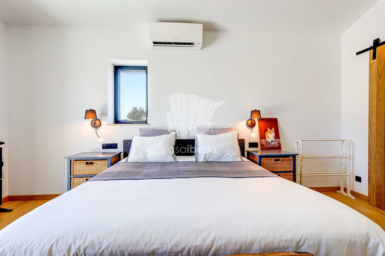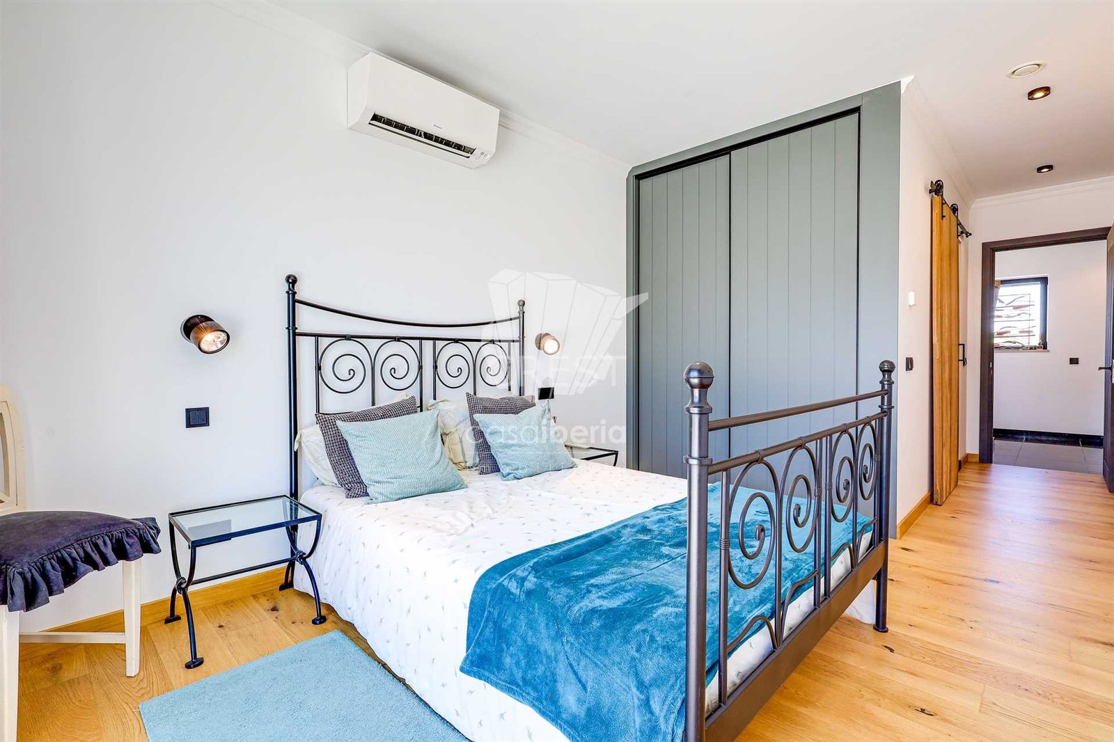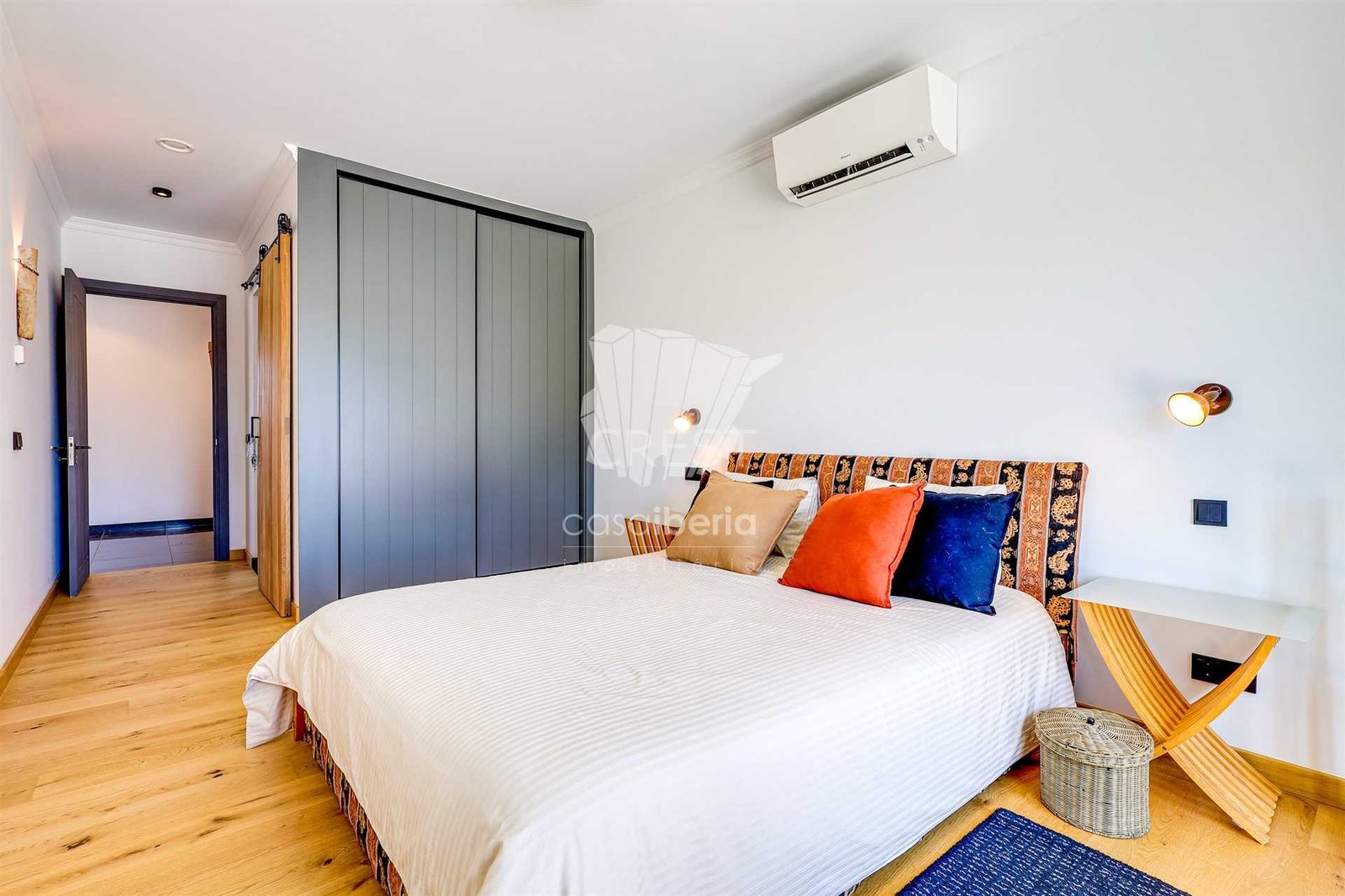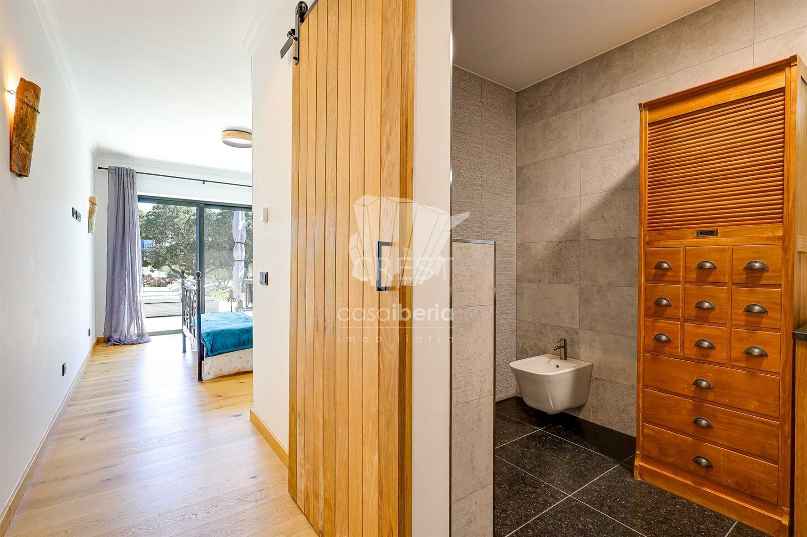On the other side, 3 bedrooms en suite including 1 master bedroom with pool views and a guest bathroom, decorated with bespoke furniture and wooden doors.